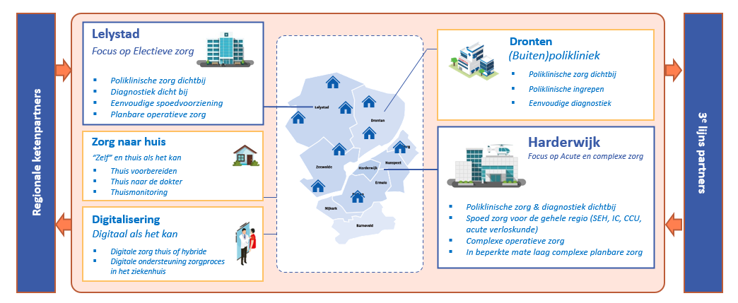 De focus in Lelystad blijft gericht op planbare zorg, terwijl Harderwijk zich vooral richt op complexe en acute zorg. In Dronten blijft de buitenpoli gehandhaafd. Samen bieden de locaties één samenhangend, volwaardig en toekomstbestendig zorgpakket voor de regio.