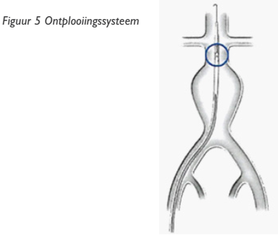 In eerste instantie wordt u naar de receptie van de operatiekamer gebracht, voordat u daadwerkelijk de operatiekamer binnen gaat. U krijgt een infuus en plakkers voor de hartbewaking en de bloeddruk wordt gemeten. Deze operatie kan onder algehele narcose plaatsvinden, maar plaatselijke verdoving (bijvoorbeeld een ruggenprik) verdient de voorkeur. Als u verdoofd bent, zal er een blaaskatheter geplaatst worden, die tijdens en na de operatie zal zorgen voor de afvoer van urine. De vaatchirurg zal beginnen met de incisies in de beide liezen om zo de beenslagaders vrij te leggen. Onder röntgendoorlichting zal het ontplooiingssysteem, met daarin de nog opgevouwen prothese, tot de juiste hoogte in de aorta worden opgevoerd. Zie figuur 5.