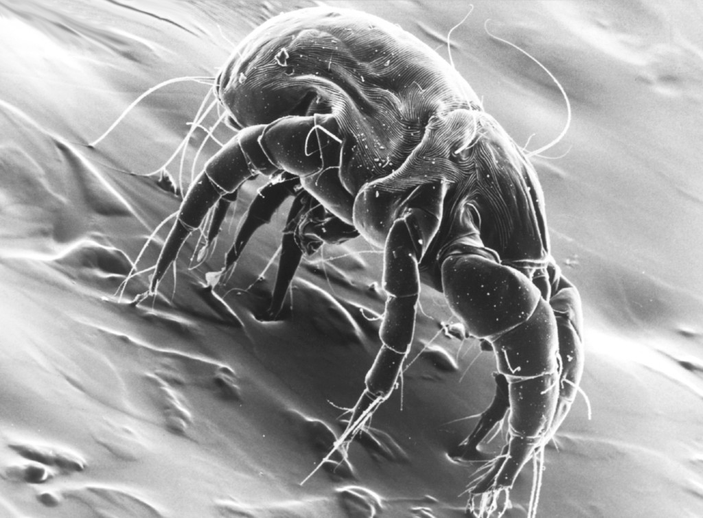 De huisstofmijt is heel klein, kleiner dan een halve millimeter (hier vergroot). Dit diertje kan een allergie veroorzaken.