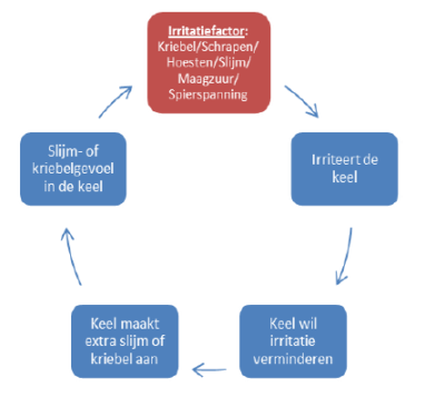 Wanneer de spieren gespannen blijven, kunt u een brok in de keel voelen. U kunt dan ook last hebben van slijm of kriebel in de keel, waardoor u gaat schrapen of hoesten. Daardoor worden de spieren nog meer gespannen en blijven de klachten bestaan. Dit heet een vicieuze cirkel (zie afbeelding 1). Als u minder gespannen bent, heeft u meestal ook minder klachten.