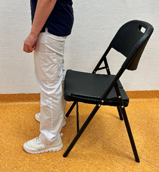 Ga voor een stoel staan met beide benen uit elkaar, voeten op heupbreedte.