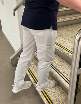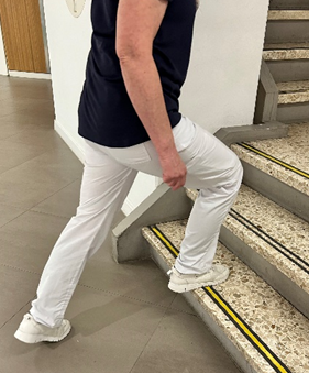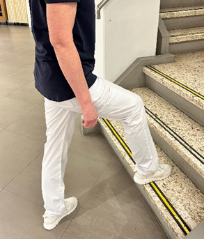Zet het geblesseerde been op de onderste trede van de trap.