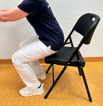Buig langzaam door de knieën tot uw billen bijna de stoel raken, maar ga niet zitten.