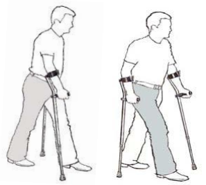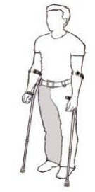 U kunt het best beginnen met het aangedane been en de tegengestelde arm en tijdens het aanleren van deze manier van lopen vooral uw aandacht bij de krukken houden.