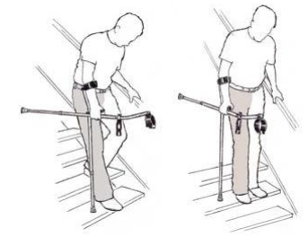 Houd met één hand de trapleuning vast en neem de beide krukken in uw andere hand.