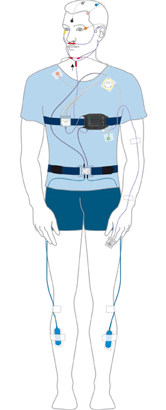 U krijgt elektroden op uw hoofd. Die meten uw hersenen tijdens de slaap. U krijgt ook andere meetapparaten. Die meten bijvoorbeeld uw ademhaling, snurken, bewegingen van uw benen en uw hartslag. Alles wordt gemeten met een draadloos systeem.