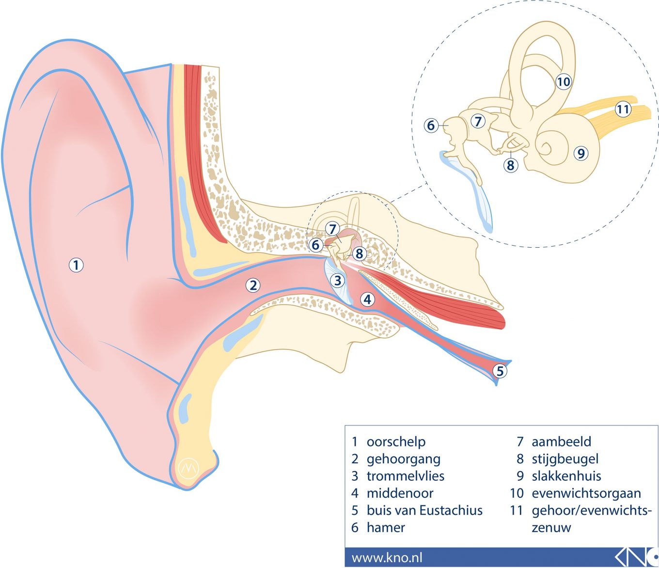 Het oor is nodig om geluid te horen. Geluid is een trilling in de lucht. Deze trilling gaat via de oorschelp en gehoorgang naar een dun vlies, het trommelvlies. Dit vlies gaat daardoor ook trillen. Het trommelvlies geeft de trillingen door aan een keten van drie kleine botjes: hamer, aambeeld en stijgbeugel. Deze botjes zitten met gewrichtjes aan elkaar vast. Ze liggen in een ruimte achter het trommelvlies, het middenoor. De stijgbeugel geeft de trillingen door aan het eigenlijke hoorzintuig: het binnenoor, ook wel het slakkenhuis genoemd.