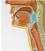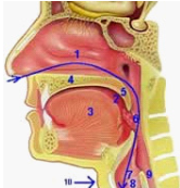 Zijaanzicht van de neusholte (1), de mondholte (2) de tong (3), het harde gehemelte (4) zachte gehemelte met in het midden daarvan de huig (5) de keelholte (6) met daaronder de stembanden (dit zijn twee witte slijmvliesplooien net onder het cijfer 7), de luchtpijp (8), die vóór de slokdarm (9) ligt en de adamsappel (10).
