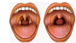 De linker tekening laat zien hoe het er voor de operatie uitziet: de huig en het zachte gehemelte zijn nog lang, de keelamandelen zitten er nog.