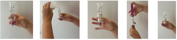 - Druk de voeding met de stamper een beetje aan. Houd de spuit hoger dan de maag, dan loopt de voeding vanzelf naar binnen.