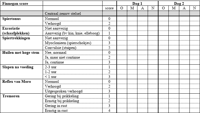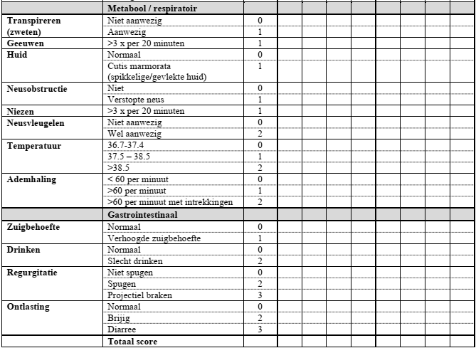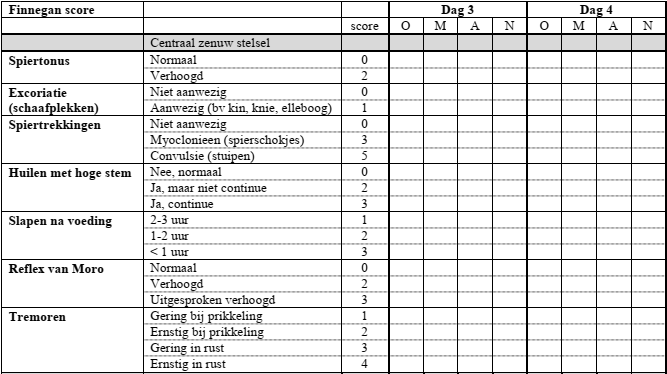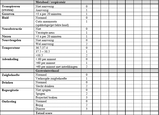 De eerste drie dagen 3-4 keer per dag scoren door kraamverzorgende en ouders.