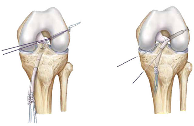 Het peesmateriaal wordt in de boortunnels in de knie gebracht op de plaats van de oorspronkelijke kruisband en verankerd in het bovenbeen en in het onderbeen.